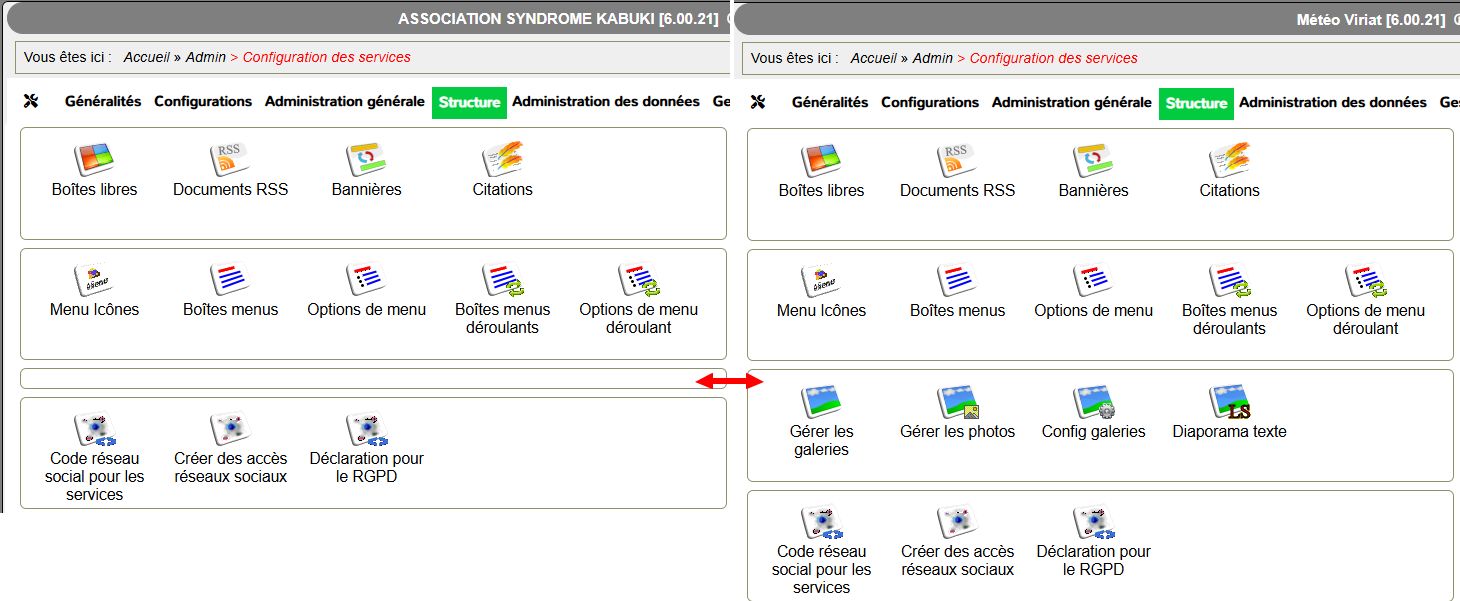 je possède 2 sites fonctionnant sous Guppy 6.00.21 (migrés par la team guppy). J'ai des galeries photos sur le premier et je voulais en créer sur le second hors je n'ai pas la possibilité, il n'y a aucun icone dans l'administration contrairement à l'autre comme vous pouvez le voir sur ces captures d'écran https://www.syndromekabuki.fr/img/2025/photos.jpg